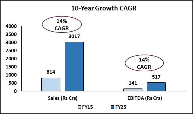 - The management has grown the company 2x the domestic market growth rate and continues to re-invest behind people, capex and new competencies. This is observable in their strong market position across key products, growing customer base and product basket. They are one of the few Indian auto component suppliers to transition to value-added segments such as Aerospace and Semiconductor.